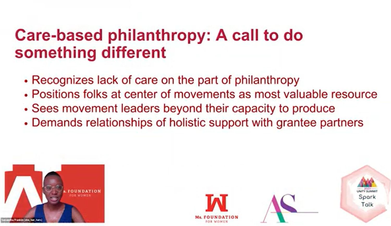 | | | Unity Summit Spark Talk Senior Program Officer Samantha Franklin collaborated with Director of Innovative Grantmaking and Research Shawnda Chapman and capacity building partner Cristina Aguilar of Aguilar Strategies on a Spark Talk about Care Based Philanthropy for the Change Philanthropy Unity Summit. The session format was a dynamic conversation between the three presenters exploring the possibilities of care-based approaches to philanthropy that are trauma informed and rooted in healing justice. A recording of the talk, entitled “Beyond Trust: Developing a Philanthropic Ethic and Practice Rooted in Care” is available here. |